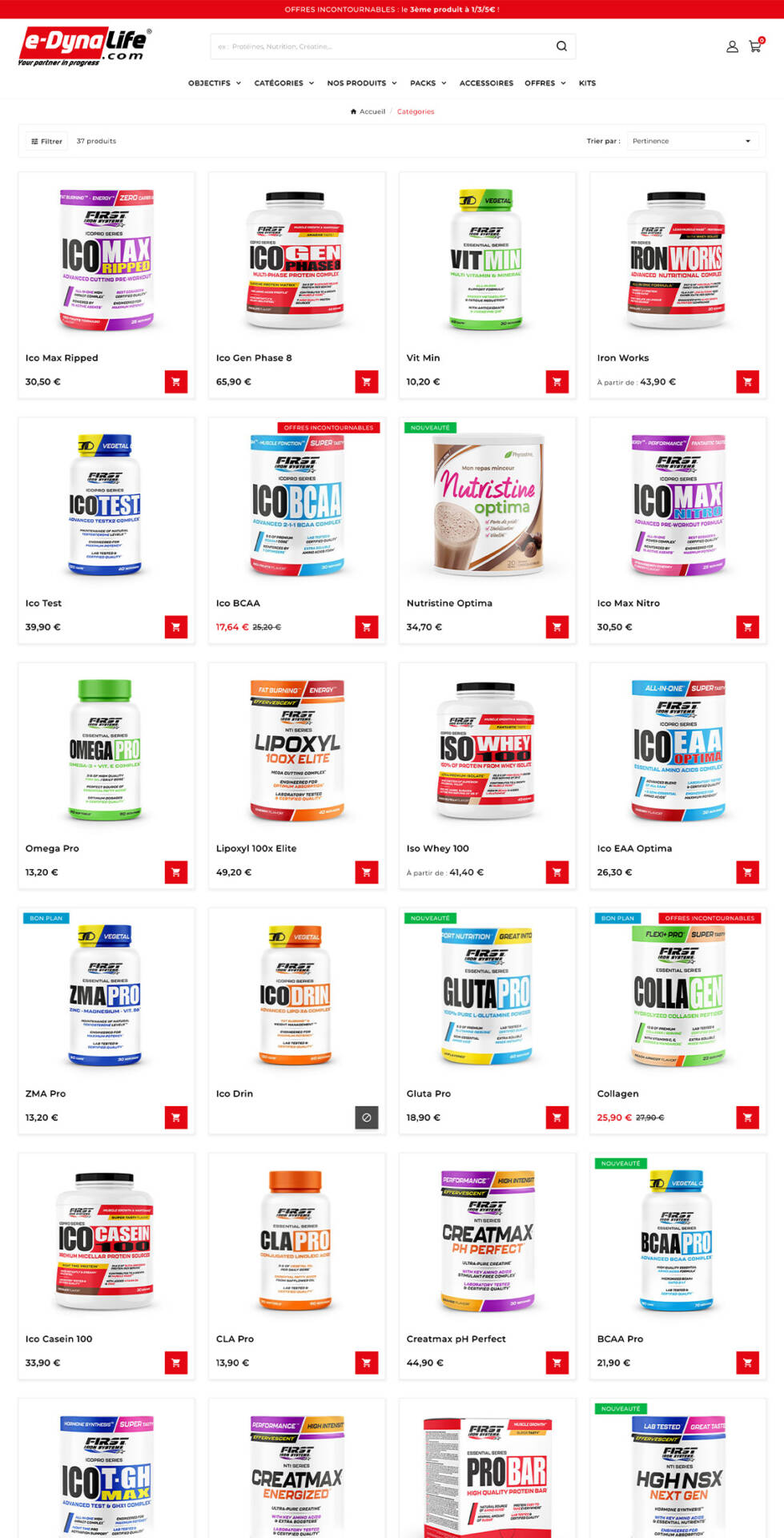Site e-commerce sous PrestaShop 8 proposant des compléments alimentaires et protéines pour les sportifs.